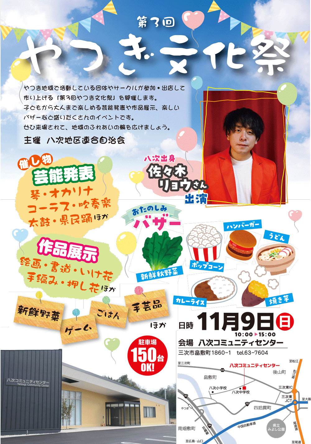 「やつき地域で活動している団体やサークルが参加・出店して作り上げる「第3回やつき文化祭」を即催します。 子どもから大人まで楽しめる芸能発表や作品展示、楽しいバザーなと盛りだくさんのイベントです。